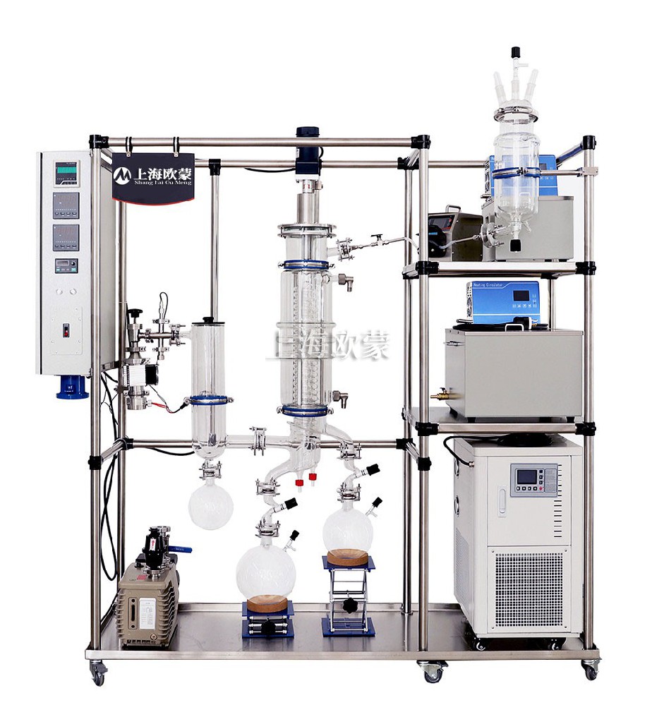 由采用垂直刮板成膜設(shè)計,物料在加熱壁上的停留時間短,對其他蒸餾而言,受熱時間一般較長(30分鐘以上甚至幾十個小時),而短程蒸餾僅為十幾秒。由于短程蒸餾加熱壁與冷凝器間有嚴格的距離要求,由液面逸出的輕分子,幾乎瞬時就到達冷凝面,汽相輕分子受熱時間在這個過程中可以忽略不計。熱分解的可能被*小化。